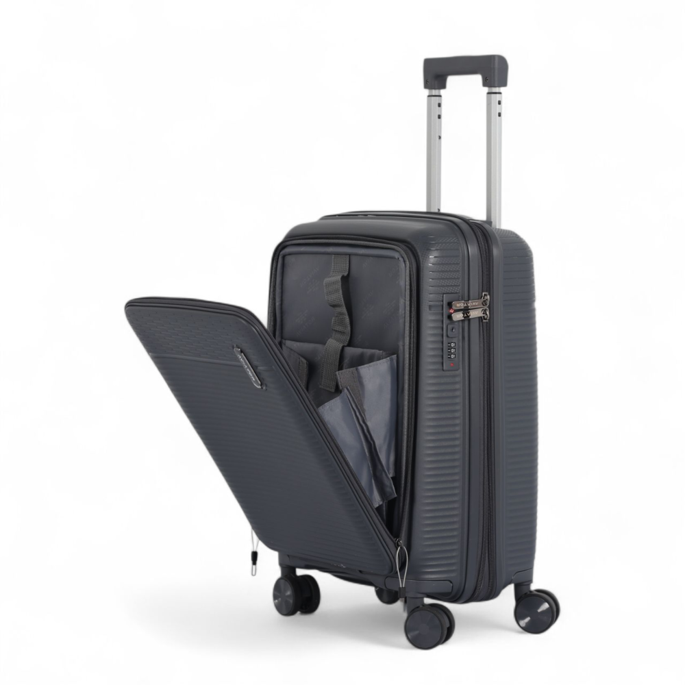 حقيبة سفر مثالية، مصممة خصيصًا لتلبية احتياجات المسافرين بالطائرة. تتميز بالجمع بين المتانة القصوى وخفة الوزن بفضل مادة البروبلين، وتوفر نظام وصول سريع مبتكر لأجهزتك الإلكترونية.