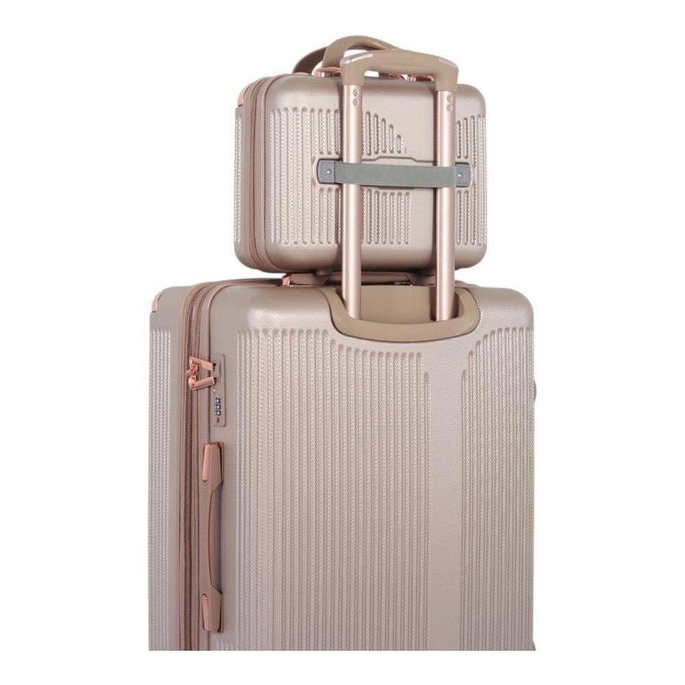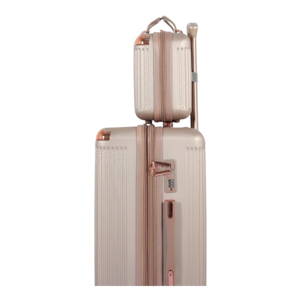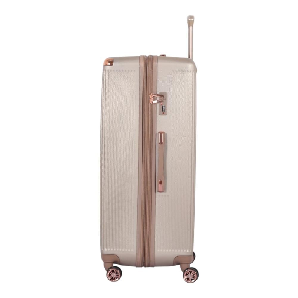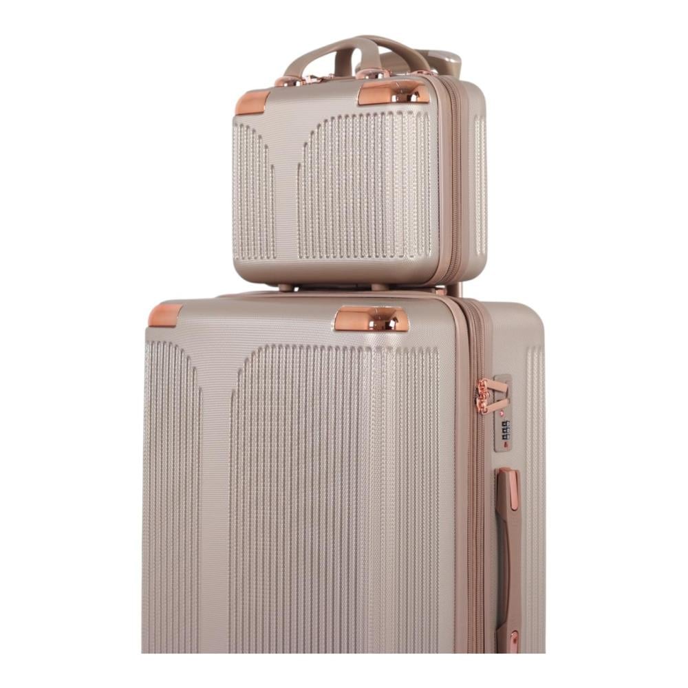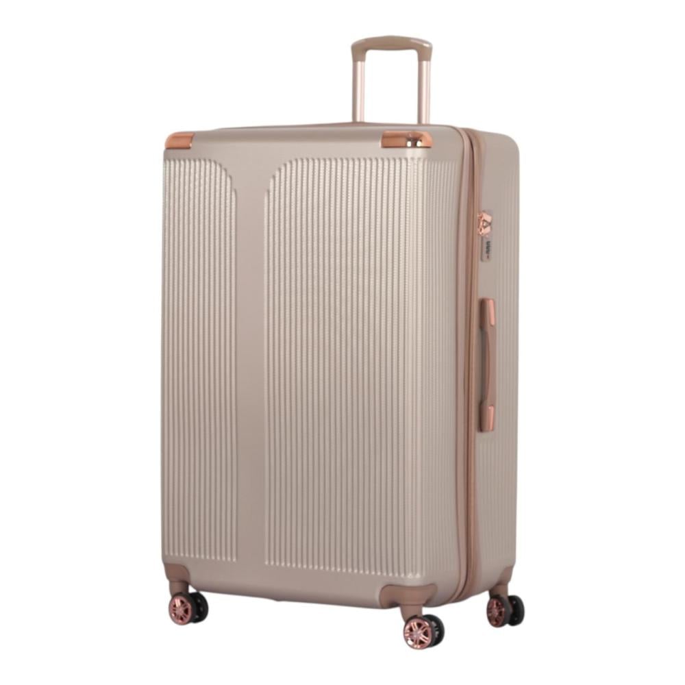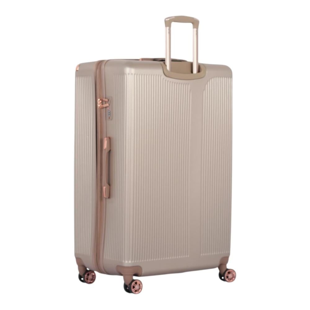 • التصميم: نقش مميز على هيكل الحقيبة (كما هو ظاهر في الصورة)، مع تفاصيل باللون النحاسي/الوردي الذهبي على المقابض والعجلات لإضفاء لمسة جمالية فاخرة.