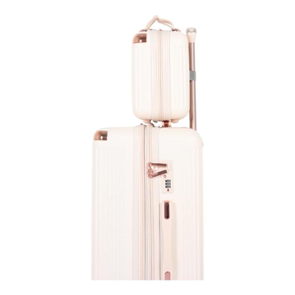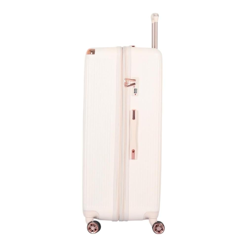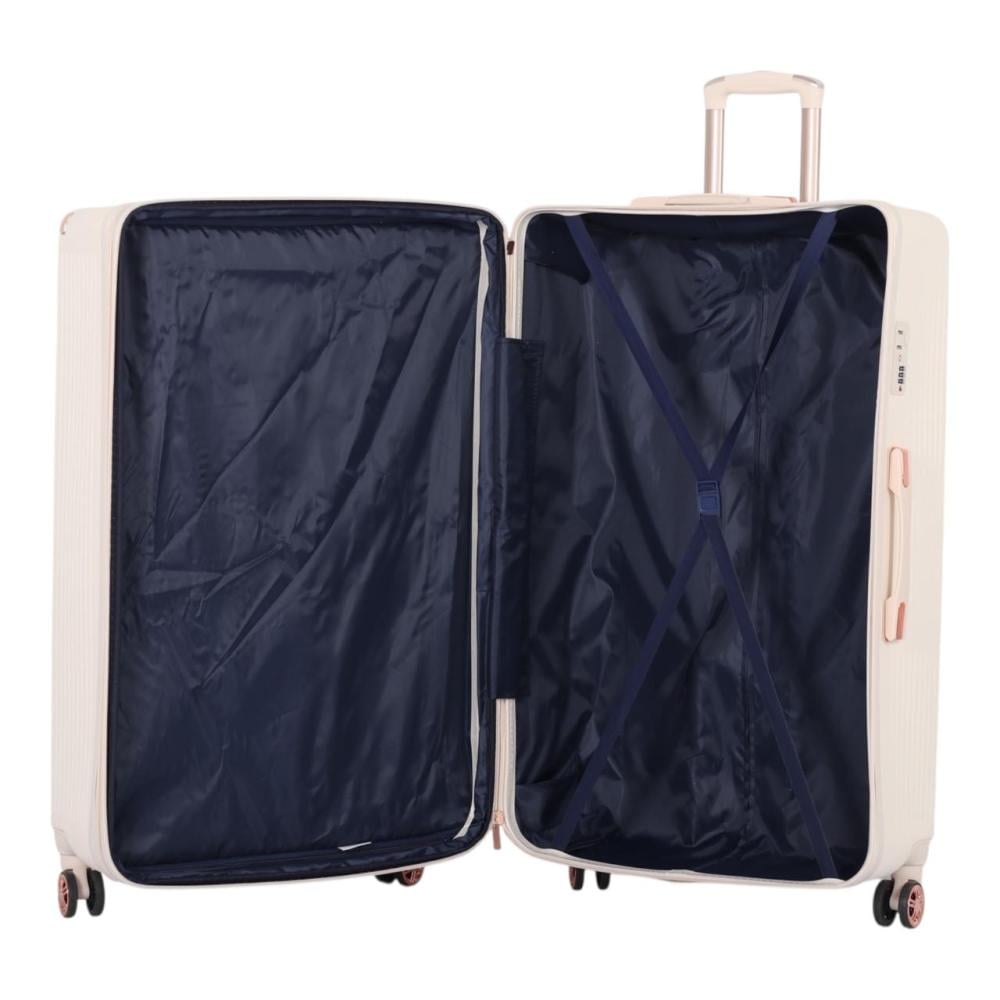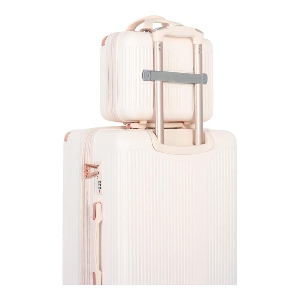 • التصميم: نقش مميز على هيكل الحقيبة (كما هو ظاهر في الصورة)، مع تفاصيل باللون النحاسي/الوردي الذهبي على المقابض والعجلات لإضفاء لمسة جمالية فاخرة.