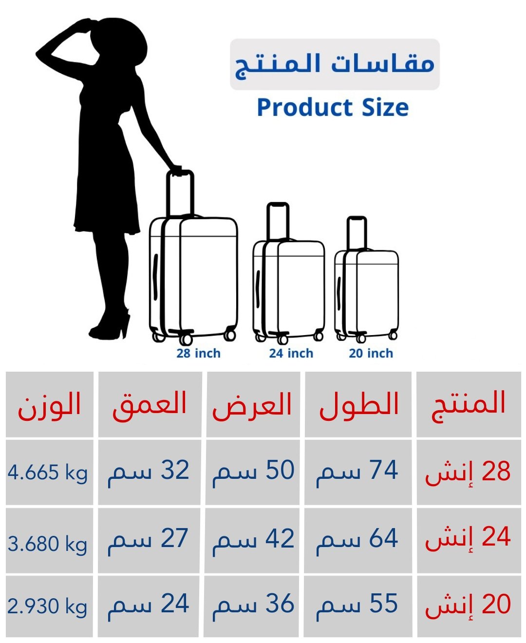 الحجمالمقاس (بوصة)الاستخدام الأمثلالصغيرة20 بوصةحقيبة المقصورة (Cabin Size)الوسطى24 بوصةالأمتعة المسجلة الخفيفةالكبيرة28 بوصةالأمتعة المسجلة للسفر الطول